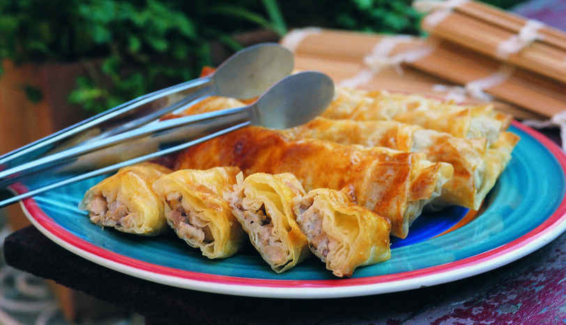 Yufkaları 4 eşit parçaya bölün. Her üçgene fırça yardımıyla ayçiçek yağı sürün. Üzerine tavuklu harçtan yayıp 3-4 parmak eninde sarın. Ardından yumurta sarısı sürüp susam serpin. Önceden ısıtılmış 200 derece fırında kızarana kadar pişirin.