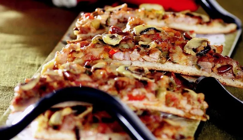 Harcı hazırlamak için, tavuk butlarını robota alıp irice çekin. İçine kıydığınız soğan, maydanoz ve sivri biberi, doğradığınız domatesi ilave edin. Dolmalık fıstığı sıvı yağda pembeleştirip yağıyla beraber harca ekleyin. Kuş üzümü, tuz, toz şeker, karabiber, doğranmış mantar ve kaşar peynirini ekleyerek iyice karıştırın. Pizzanın hamurunu hazırlamak için, unu derin bir kaba eleyin. Ortasını açarak, tuz ve toz şekeri ekleyin. Mayayı unun ortasına dökün. Üzerine ılık sütü ekleyerek karıştırın. Maya eridiğinde sıvı yağı ilave edin. Yumuşak kıvamlı bir hamur elde edene dek yoğurun. Yarım saat dinlendirip merdane yardımıyla incecik açın. Tepsiye yerleştirerek üzerine karabiber serpin. Salçayı hamurun üzerine sürün. Kaşar peyniri serperek tavuklu harcı yerleştirin. Önceden ısıtılmış 200 derece fırında pişirin. Çıkardığınızda üzerini istediğiniz şekilde süsleyerek servis yapın.