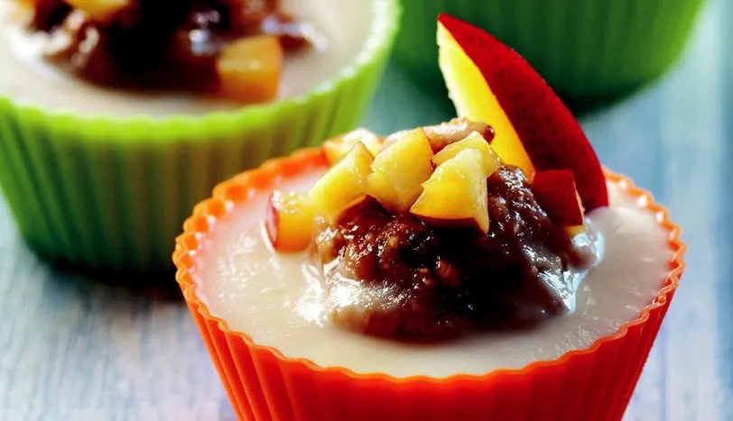 1 krema için jelatinleri soğuk suyun içinde 15 dakika bekletin. Süt ve yumurtayı derin bir kapta pütürkalmayacak şekilde çırpıcı ile iyice çırpın. Toz şeker ve kremayı ilave edip, sürekli karıştırarak koyu bir kıvam alana kadar pişirin. Göz göz olmaya başlayınca tencereyi ocaktan kaldırın. 2 Vanilya ile sudan çıkarıp, elinizle sıktığınız jelatini ekleyin. Mikserle iyice çırptıktan sonra küçük silikon muffin kalıplarına birer parmak olacak şekilde kremayı paylaştırın. 3 Diğer taraftan acı badem kurabiyesi ve bademi robottangeçirip, bir kaba alın. İçine 2 çorba kaşığı kremayı katın ve yoğurduktan sonra sulu köfte büyüklüğündeyuvarlak toplar hazırlayın. Bu topları muffin kalıplarının içindeki karışımın ortasına koyun. 4 Kalan krema karışımını kaplara paylaştırın. Donması için buzdolabında 1 gece bekletin. Üzerine küp şeklinde doğranmış şeftali koyup servis yapın.AŞÇININ NOTUDilerseniz tatlıyı servis tabağına çıkarıp, dilediğiniz meyve ile servis yapabilirsiniz.
