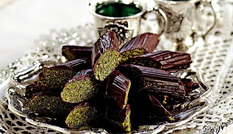 Kabukları soyulmuş antep fıstığı ve bademi robottan geçirin. Bir tencerede toz şeker, su ve balı koyu bir şurup haline gelene kadar kaynatın. Ilındıktan sonra robottaki malzemenin üzerine ilave edin ve tüm malzemeyi birlikte çekin. Karışımı düz bir zemine alın ve iki parçaya ayırın. Her bir parçayı elinizle yuvarlayarak rulo haline getirin. Çikolatayı benmari usulü eritin ve fırça ile ruloların üzerine sürün. Çikolata donunca ruloları ters çevirin ve bu yüzlerine de çikolata sürün. Bıçakla verev şeklinde kestikten sonra soğumaya bırakın.