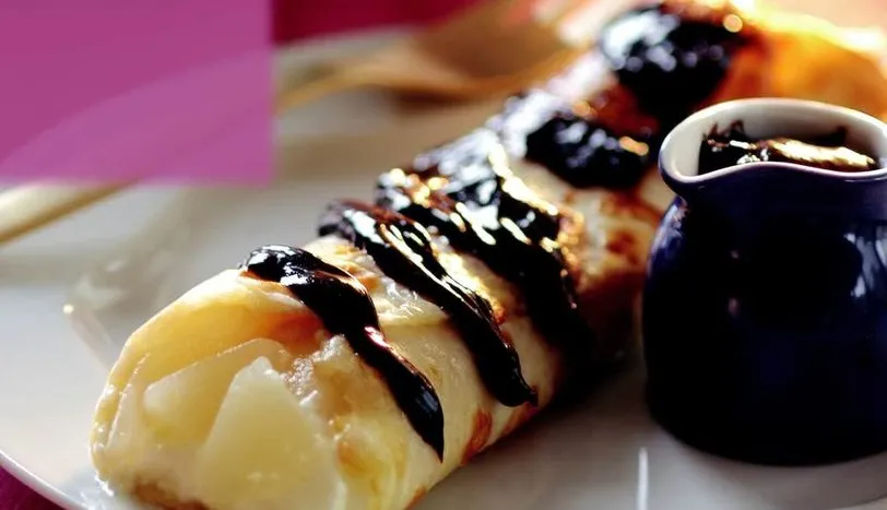 Sıvı yağ haricindeki tüm krep malzemesini geniş bir kaba alıp iyice çırpın. Oda sıcaklığında 30 dakika dinlendirin. Yapışmaz yüzeyli tavada çok az miktardaki sıvı yağı kızdırın. Krep hamurundan bir kepçe alıp, tavada önlü arkalı kızartın. Krep hamurunun tümü bitene kadar aynı işlemi tekrarlayın. Armutların kabuğunu soyun. Dilimleyip, kendi suyunda pişirin. Kreplerin içine kaymak sürüp, pişen armut dilimlerini yerleştirin. Rulo yapıp, çikolata sos ve reçel ile servis yapın.