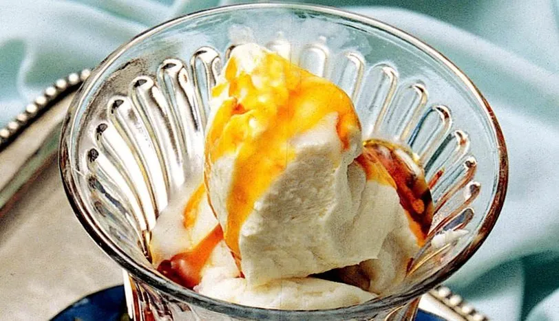Krem şantiyi sütle birlikte koyulaşana dek çırpın. Donması için buzlukta bekletin. Karamel için de, şeker ve suyu kaynatın. Badem kavurması için iri kıyılmış bademleri zeytinyağı ve şekerle kavurun. Dondurma kuplarının içine öncelikle karamel, üzerine bir top sade dondurma ve sırasıyla iki çorba kaşığı krem şanti, badem kavurması ve bir top sade dondurma daha koyun. En son olarak da, üzerlerine karamel sos gezdirip servis yapın.