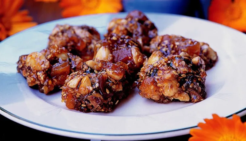 Tozşekeri suyla karıştırıp kaynatın. Koyulaşana kadar kaynatmaya devam edin. Bademleri kaynar suda bekletip kabuklarını soyun. İncir ve kayısıları küçük doğrayın. Badem, incir, kayısı ve rendelenmiş portakal kabuğunu şurubun içine atın. Suyunu çekene kadar kaynatın. 25x25 cm ebadında bir kalıbı yağlı kağıtla kaplayın. Karışımı kalıba yayın. 1 gece buzdolabında bekletin. Ertesi gün kare dilimleyip servis yapın.