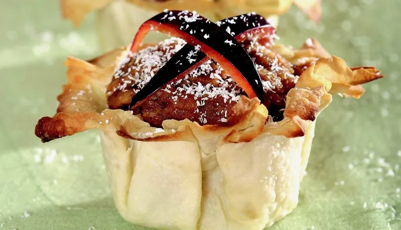 Yufkalardan 20 x 20 cm ebadında 24 adet kare kesin. Ateşe dayanıklı kaseleri ters çevirin ve tereyağı ile yağladığınız iki adet kare yufkayı çapraz gelecek şekilde yerleştirin. Diğer yufkaları da aynı şekilde hazırlayın. Yufkalı kaseleri fırın tepsisine yerleştirin. Önceden ısıtılmış 170 derece fırında üzerileri kızarana kadar pişirin. Ilındıktan sonra kaselerden çıkarın. Diğer tarafta hurmaları ayıkladıktan sonra çatalla ezin. Yapışmaz yüzeyli bir tavada suyunu salıp çekene kadar kısık ateşte pişirin. Soğuduktan sonra içine elinizle ufaladığınız acıbadem kurabiyelerini katın. Bademleri sıcak suda 20 dakika tutup, kabuklarını soyun ve hurmaların içine ilave edin. Bütün malzemeyi yoğurun. 12 adet parça koparıp, elinizle yuvarlayarak kurabiyeler hazırlayın. Yağlanmış fırın tepsisine dizin ve önceden ısıtılmış 170 derece fırında 10 dakika pişirin. Kurabiyeleri çanakların içlerine yerleştirin. Üzerlerine hindistan cevizi ve siyah erikten kesilmiş ince bantları yerleştirip servis yapın.