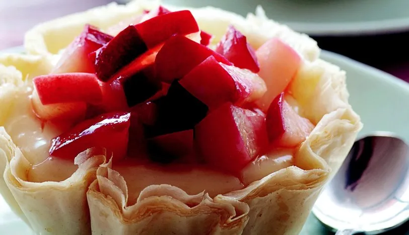 Şeftalilerin kabuklarını temizleyip küp şeklinde doğrayın. Toz şeker, limon suyu ve su ekleyip, reçel kıvamı alana dek pişirin.Ayrı bir yerde 8 adet baklavalık yufkanın arasına tereyağı sürüp, dilediğiniz büyüklükte yuvarlaklar şeklinde kesin. Kenarlarını toparlayıp çanak şekli verin ya da fırına dayanıklı yağlanmış yuvarlak bir kaba koyun. Kalan 8 adet yufkayı da aynı şekilde hazırlayın. Önceden ısıtılmış 180 derece fırında hafif kızarana dek pişirin.Krema için süt, yumurta, un, nişasta ve toz şekeri bir tencereye alıp çırpın. Ocağa oturtun ve krema kıvamı alana dek karıştırarak pişirin. Vanilya ve tereyağı ekleyip ocaktan alın. Çırpma teliyle 10 dakika çırpın. Soğuduktan sonra yufka çanaklarının içlerine kremayı pay edin. Üzerine şeftalili sosu gezdirip servis yapın.