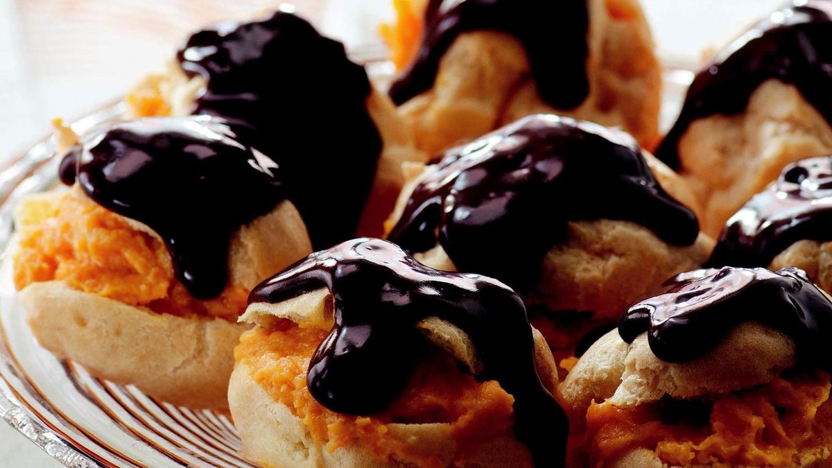 Soğuk hamurları kopmayacak şekilde enlemesine ikiye bölün. Ortalarına bal kabaklı püreyi pay edin. Hazır çikolata sosu paketin üzerindeki tarife göre hazırlayın. Profiterolleri doldurduktan sonra sosu üzerine gezdirip servis yapın.