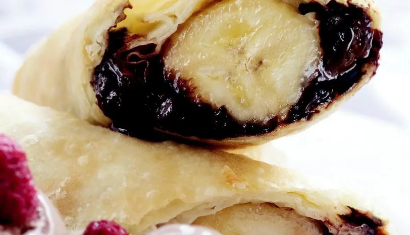 Yufkayı enlemesine ve boylamasına kesip, dört parça elde edin. Yufka parçalarından birinin geniş kenarına bir adet muz yerleştirin ve üzerine çikolata serpin. Yufkanın iki kenarına fırçayla yumurta akı sürün ve sigara böreği sarar gibi sarın. Diğer yufkaları da aynı şekilde hazırlayın. Kızdırılmış sıvıyağda önlü arkalı kızartın. Dondurma ve frambuaz ile birlikte servis yapın.