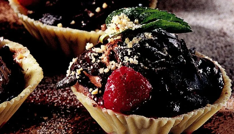 Beyaz çikolatayı benmari usulü eritin. Minik pasta kalıplarını 3'er 3'er içiçe geçirin (toplam 6 adet kalıp oluşacak). Erittiğiniz çikolatayı ılıkken, kalıplara fırça ile sürün. Buzdolabında 5 dakika bekletip, tekrar eritilmiş çikolata sürün. Bu işlemi 3-4 kez tekrar edin. Sonrasında 30 dakika buzdolabında bekletin. Bu arada sos için, ahududuları blenderden geçirin. Ardından süzgeçten geçirip servis tabağına yayın. Beyaz çanakları dolaptan alıp, dışındaki kağıtları çıkarın. İçlerine dondurmayı pay ederek koyun. Çanakları ahududulu servis tabaklarına yerleştirip, üzerlerine parça çikolataları serperek, servis yapın.
