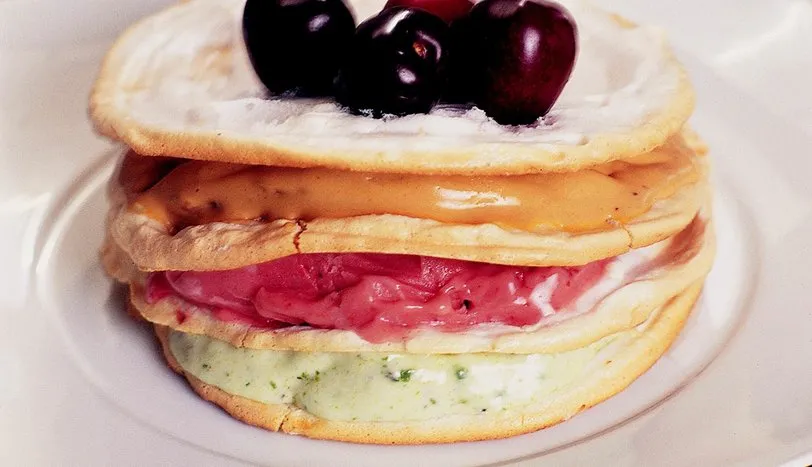 Yumurta aklarını pudra şekeri ve vanilya ile birlikte kar gibi olana dek çırpın. Karışımı krema torbasına doldurun. İçine yağlı kağıt konulmuş fırın tepsisine, büyüklüğüne bağlı olarak 3 ya da 6 yayvan top sıkın. Önceden ısıtılmış 110 derece fırında üzeri hafif pembeleşene dek pişirin. Servis tabağına bir kat beze, bir kat dondurma şeklinde dizin. En üstünü de kirazla süsleyerek servis yapın.