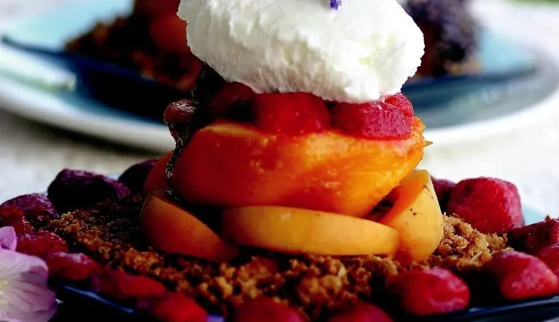 Krem şantiyi sütle çırpın. Dondurmayı ekleyip karıştırın ve buzdolabında soğutun. Diğer taraftan bisküvileri elinizle ufalayın. Tereyağını geniş bir tavada eritip, üzerine bisküvileri ekleyin. Yağı eminceye kadar birkaç dakika kadar kavurup, ocaktan alın. Daha sonra arzunuza göre bir kalıba (derin olmayan küçük bir kap olabilir) kavrulmuş bisküvi koyarak, üzerine bastırıp yerleştirin. Servis tabağına ters çevirerek çıkarın. Bisküvi bitene kadar aynı işlemi sürdürün. Bisküvili tabakları buzdolabında 10 dakika bekletip, hafifçe dondurun. Şeftalilerin kabuklarını soyup ikiye bölün ve çekirdeklerini çıkarın. Bisküvilerin üzerine yarım şeftali koyun. Yanlarına dilimlenmiş kayısı yerleştirin. Şeftalinin üzerine krem şantili dondurma ekleyin. Çilekle süsleyerek servis yapın.