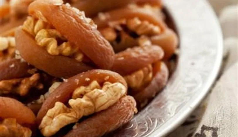 2. Ertesi sabah yumuşamış kayısıları sudan alın, yarık kısımlarını hafif açıp içine cevizlerin yarısını koyun ve bir servis tabağına yerleştirin.