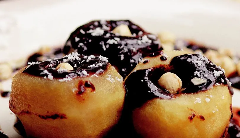 Elmaları soyun ve orta kısımlarını oyarak çıkarın. Tencereye alıp, üzerine su ve flekeri koyun. Tencerenin kapağını kapatarak, elmalar yumuşayana dek pişirin. Elmalar piştikten hemen sonra, vanilyayı ilave edin ve elmaları ateşten alın. Oyulmuş kısımlarına fındık taneleri atın. Diğer tarafta margarin ve çikolatayı bir-iki kaşık su ile karıştırın. Hafif ateşte eriterek çikolatalı sos hazırlayın. Elmaların servis yapılacağı tabağa pudraşekeri serpin. Elmalar soğuyunca tabağa alın. Üzerine sıcak çikolatalı sos gezdirin. Ardından soğuk olarak servis yapın.