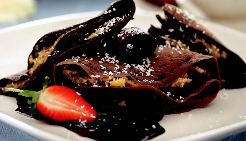 KREPLERİ hazırlamak için yumurtaları toz şekerle çırpın. Üzerine kalan malzemeleri ekleyip karıştırın. Yapışmaz yüzeyli bir tavayı kızdırıp tereyağı sürün. Hazırladığınız karışımdan yarım çorba kepçesi kadar alıp tavaya dökün. Tavayı sallayarak krebi tek taraflı olarak pişirin. (İki tarafını da pişirmeye kalkarsanız damla çikolatalar iyice erir). Bu şekilde tüm harç bitene kadar krepleri pişirip kenara alın. İçini hazırlamak için, gofretleri ve kayısıları robotta çekin. Üzerine muzu ekleyin. Bu harcı kreplerin içine koyarak sarın. Çilekle süsleyerek servis yapın.
