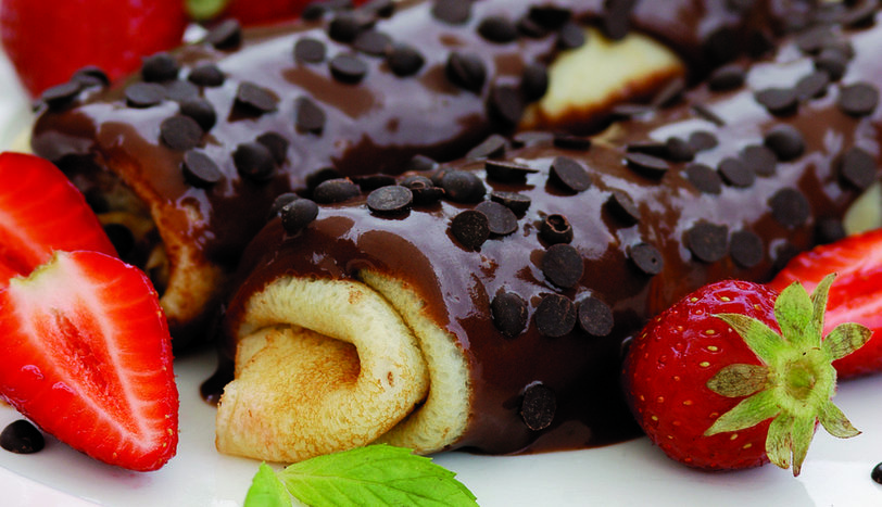 Krep için yumurtaları bir kapta iyice çırpın. Üzerine süt, sıvı yağ, tuz ve toz şekeri ekleyip, çırpma teliyle çırpın. Yapışmaz yüzeyli tavaya çok az yağ sürün. Krep karışımından birer kepçe tavaya dökün. Her iki tarafını sarı renk alana kadar kızartın. Çikolata sos için tüm malzemeyi benmari usulü eritin. Ardından çikolata sosu kreplerin içine düzgünce sürün. Muzları iki parçaya bölüp kreplerin içine yerleştirin ve rulo şeklinde sarın. Çikolata sosu kreplerin üzerine gezdirin. Damla çikolata serpiştirip servis yapın.
