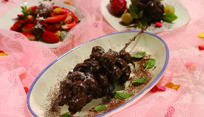 Bitter çikolatayı benmari usulü eritin. Üzüm salkımını yıkayıp kurulayın ve hiç bozmadan eritilmiş çikolataya bulayın. Bir müddet bekletip, salkımı tekrar çikolataya bulayın ve servis tabağına aktarın. Buzdolabında dondurup çıkarın. Çilek dilimleriyle süsleyin. Üzerine pudra şekeri serpip servis yapın.