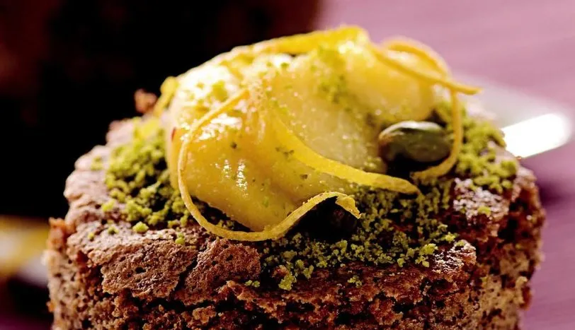 Tüm şerbet malzemesini bir tencereye alıp ocağa oturtun. Kaynadıktan birkaç dakika sonra ocaktan alıp soğumaya bırakın. Diğer taraftan yumurtaların akını ve sarısını ayırın. Yumurta sarılarını pudra şekeri ile birlikte bir kaba alın ve mikser yardımıyla kabarana dek çırpın. Yumurta aklarına toz şeker ekleyip çırpma teli ile çırpın (köpük köpük olması gerekmiyor). Kabaran yumurta sarısı ve akını birlikte bir kaba alın. Üzerine çikolata, un, fındık ve kabartma tozu katıp yavaşça karıştırın. Hazırladığınız harcı yağlanmış bir tepsiye yayın. Önceden ısıtılmış 160 derece fırında 40 dakika pişirin. Fırından alıp sıcak tatlının üzerine soğuk şerbeti yavaş yavaş çektirerek dökün. Soğutup istediğiniz şekilde dilimleyin. Üzerini antep fıstığı, şeftali dilimleri ve rendelenmiş limon kabuğu ile süsleyerek servis yapın.