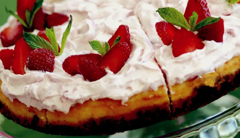 Tabanı için bisküvileri dövüp, erittiğiniz tereyağı ile karıştırın. Karışımı yağlı kağıtla kaplanmış kelepçeli yuvarlak kek kalıbına, elinizde bastırarak yerleştirin. Buzdolabında 1 saat dinlendirin. Çikolatayı benmari usulü eritip, yarım su bardağı toz şeker ve tuz ilave edin. 1 su bardağı krema ve yumurtaları ekleyip karıştırın. Ardından labne peynirini ekleyip karıştırın ve tabanın üzerine yayın. Önceden ısıtılmış 180 derece fırında 45 dakika pişirin. Sürenin sonunda fırını kapatın ve 15 dakika fırının kapağı açık olarak dinlendirin. Kalan 3 çorba kaşığı toz şeker, 3 çorba kaşığı krema ve vanilyayı çırpın. Çilekleri püre haline getirip, ekleyin. Buzdolabında 3 saat dinlendirip cheesecake'in üzerine sürün. Dilediğiniz şekilde süsleyip, dilimleyerek servis yapın.