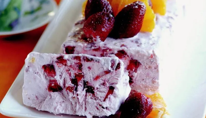 Çilekleri ezip, portakal suyu ile karıştırın. Toz şekeri ilave edin. Ayrı bir yerde kremayı çırpıp, çilekli püreye ekleyin. Karışımı dikdörtgen bir kalıba döküp, derin dondurucuda dinlendirin. En az 3-4 saat sonra donup donmadığını kontrol edip dondurucudan alın. Çilek ve portakal dilimleri ile süsleyip servis yapın.