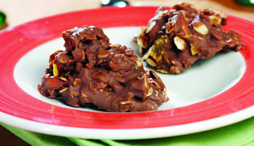 Bitter çikolatayı benmari usulü eritin. Erimiş çikolatayı geniş bir kaseye alın. Üzerine sıvı tatlandırıcı, limon kabuğu rendesi ve mısır gevreği ekleyip karıştırın. Alüminyum folyo üzerine çikolatalı karışımdan birer yemek kaşığı koyun. Karışım bitene kadar işleme devam edin. Folyoyu sararak buzdolabında 2 saat bekletin. Katılaşan parçaları servis tabağına alıp servis yapın.