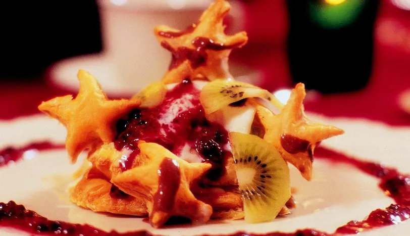 1 adet milföyden, küçük yıldız şeklinde kurabiye kalıplarını kullanarak 12 adet yıldız yapın. Ardından, 12 adet yıldızı ve kalan 4 adet milföy hamurunu 175 derece fırında kızarana dek pişirin. Soğutmadan önce milföy karelerinin içini hafifçe oyun. Frambuaza biraz su katarak, mikserde çırpın ve sos haline getirin. Milföyü tabağın ortasına yerleştirin. Bir top dondurmayı, milföyün üzerine yerleştirin ve kivi dilimlerini serpiştirin. Bir top dondurma daha koyup, milföy yıldızlarını dondurmaya batırarak süsleyin. Diğer milföy hamurlarına da aynı işlemi uygulayın. Frambuaz sosuyla birlikte servis yapın.