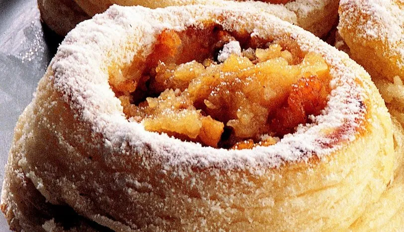 Öncelikle volovanları hazırlayın. Bunun için milföyden su bardağının ağzı ile yuvarlaklar kesin. 4 tanesini kenara ayırın. Kalan 8 parça yuvarlak milföylerden çay bardağının ağzı ile küçük yuvarlaklar kesin. Kestiğiniz bu milföyleri ayırdığınız 4 adet milföyün üzerine ikişer adet olacak şekilde yerleştirin. Bu şekilde 4 adet volovan elde edin. Daha sonra üzerilerini elma suyu ile hafifçe ıslatın. İçi için, elmaları soyup rendeleyin. Ceviz ve tarçın ekleyip karıştırın. Harcı volovanlara paylaştırın. Üzerlerine yumurta sarısı sürün. Önceden ısıtılmış 180 derece fırında milföyler kabarıp pembeleşene kadar pişirin. Pudra şekeri serpip, servis yapın.
