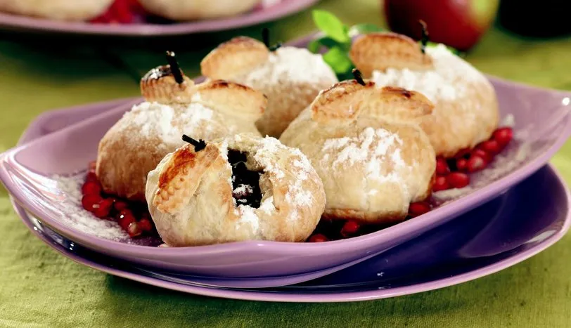 Elmaları soyup küp doğrayın. Bir tavaya alıp üzerine toz şeker ekleyin ve renkleri dönene kadar kavurun. Üzümleri de ilave ettikten sonra bir iki defa çevirip ocaktan alın. Ceviz ve tarçın ekleyip karıştırın. Harç soğuduktan sonra bir parça milföyün ortasına bolca koyun. Yuvarlak olacak şekilde kapatın. 10 adet milföyü bu şekilde hazırlayın. Kalan iki parça milföyden minik yapraklar hazırlayıp yuvarlak hamurların üstüne yapıştırın. Her birinin üstüne bir çöp şiş parçası ile sap yapıp elma şeklini verin. Bir fırın tepsisine dizip önceden ısıtılmış 180 derece fırında kabarıp kızarıncaya kadar pişirin. Ilındıktan sonra üstlerine pudra şekeri serpip servis yapın.