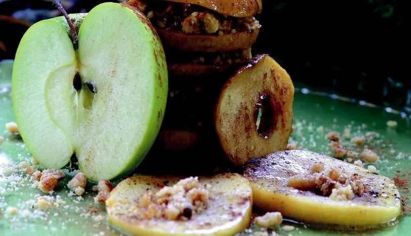 Elmaları yuvarlak dilimleyin. Çekirdek yataklarını çıkarın. Tereyağını tavaya alarak 4 çorba kaşığı esmer şekeri ilave edin. Karamel olana kadar karıştırarak pişirin. Elma dilimlerini karamele atıp birkaç dakika arkalı önlü hafifçe pişirin. Yarısını fırın kabına tek sıra yerleştirin. Üzerine kalan 4 çorba kaşığı esmer şeker ve 1 su bardağı ceviz serpin. Kalan elma dilimlerini üzerine dizin. Önceden ısıtılmış 180 derece fırında 15 dakika pişirip, ılınmaya bırakın. Servis tabağına alın. Üzerine yarım su bardağı ceviz ve tarçını serperek servis yapın.