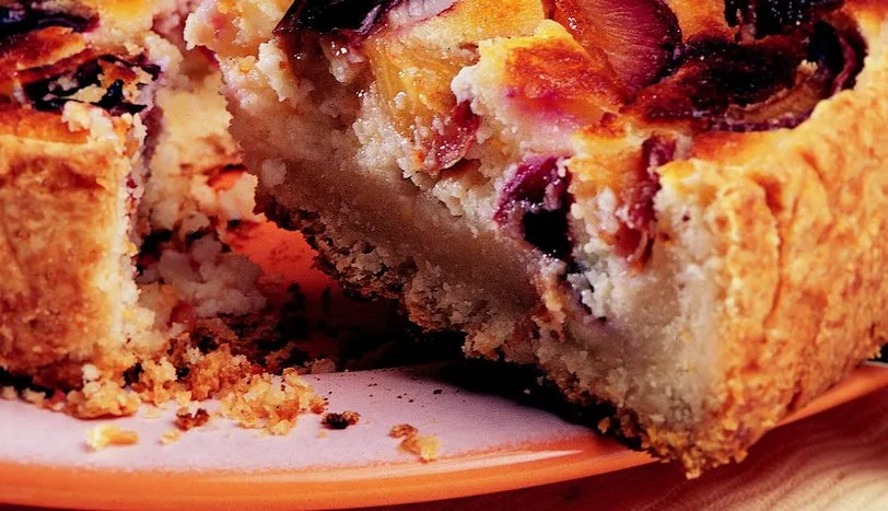 Öncelikle eriklerin çekirdeklerini çıkarın ve dilimleyin. Hamur için bir kasede un, margarin, toz şeker ve tuzu karıştırın. Hamur ekmek kırıntısı görünümü almaya başladığında, yavaşça sütü ekleyip, iyice yoğurun. 22 cm çapında bir kabı yağlayıp hamuru dibine yayın. Hamurun kenarlarını 3 parmak kadar yükseltin. Üzeri için beyaz peyniri bir kaba rendeleyin. İçine krema, toz şeker, yumurta, un ve rendelenmiş limon kabuğunu ilave edip karıştırın. Karışımı hamurun üzerine boşaltın. Dilimlenmiş erikleri üzerine yerleştirin. Önceden ısıtılmış 175 derece fırında üzeri kızarana kadar pişirin. Ilındıktan sonra dilimleyerek servis yapın.