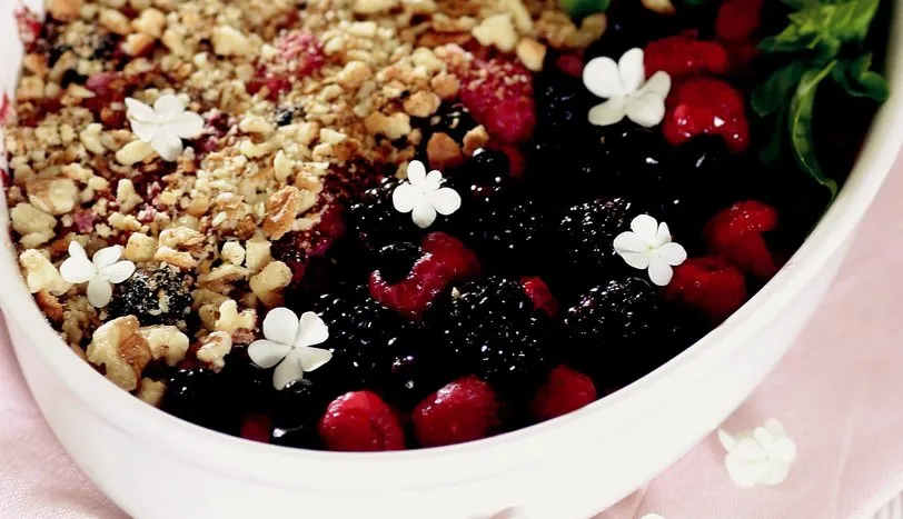 Bir fırın kabına frambuaz, böğürtlen ve yaban mersinlerini koyup üzerine esmer şekeri serpin. Önceden ısıtılmış 200 derece fırında meyveler yarı yarıya yumuşayana kadar pişirin. Fırından çıkarıp üzerine blenderden geçirilip cevizle karıştırılmış pötibör bisküvileri serpin. Yeniden fırına verin. Birkaç dakika sonra çıkarıp fesleğen yaprakları ile süsledikten sonra servis yapın.