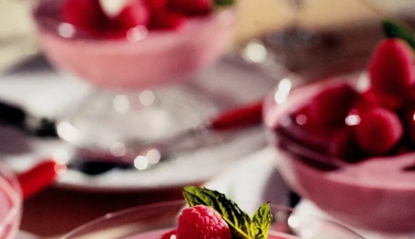 İlk olarak jelatinleri 1 çay bardağı soğuk suda bekleterek yumuşatın. Yumurtaların sarılarını ve aklarını ayırın.Yumurta sarılarının üzerine toz şekeri ekleyip beyazlaşıncaya kadar mikserleyin. Sütü kaynatıp bu karışıma yedirerek ekleyin. Soğuması için kenara alın. Frambuazları çatalla ezin ya da blenderden geçirin. Yumuşayan jelatinleri frambuaza ekleyip karıştırarak erimesini sağlayın. Diğer tarafta yumurta aklarını kuru cam veya porselen bir kaseye alın. Kremayı ekleyip kıvam alıncaya kadar mikserleyin. Soğuyan sütlü karışıma frambuaz ve yumurta akını ekleyip, metal bir kaşıkla karıştırın. Karışımı cam kaselere paylaştırın. Sertleşmesi için buzdolabında en az 2 saat bekletin. Frambuaz sos için toz şeker, mısır nişastası, su, limon suyu ve tuzu bir tencereye alıp karıştırın. Frambuazları ekleyip koyulaşana kadar pişirin. Buzdolabından çıkardığınız frambuazların ortasına birer top vanilyalı dondurma koyun. Üzerine frambuaz sos gezdirip, frambuaz ve nane yaprağı ile süsleyerek servis yapın.
