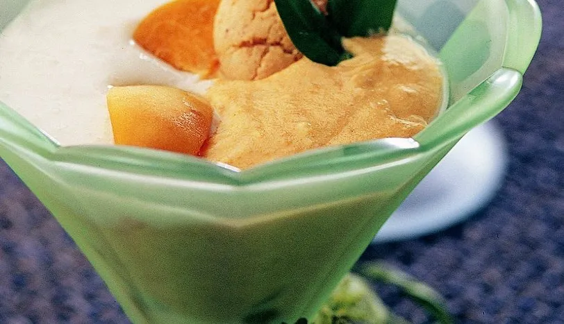 Kayısıların çekirdeklerini çıkarın ve dilimleyin. Bir kapta 1 çorba kaşığı tozşeker ile limon suyunu karıştırın.Yumurtaların sarı ve aklarını ayırın. Kalan tozşeker ile yumurta sarılarını iyice çırpın. Şarabı da katın ve karıştırın. Bu karışımı benmari usulü, arada bir karıştırarak 10 dakika pişirin. Krema iyice yumuşadıktan sonra kaynamadan ateşten alın ve dinlenmeye bırakın. 2 adet yumurtanın akını iyice çırpın ve krema ılıkken ilave edin. Dilimlenmiş kayısıları kuplara pay edin ve üzerine hazırladığınız kremadan koyun. Daha sonra hazır kremayı pay edin ve buzdolabında 1-2 saat bekletin. Üzerini kayısı ve acıbadem ile süsleyip, servis yapın.