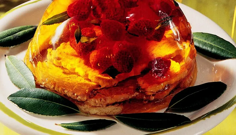 Suyu bir kaba aktarıp, toz jöleyi bu suda eritin. Jölenin üçte birini 1 litrelik derin bir kaba koyun. Buzdolabında yarım saat kadar dondurun. Dolaptan çıkarıp, üzerine çileklerin yarısını dağınık olarak koyun. Aralara nane yapraklarının bir kısmını serpiştirin. Üzerine kalan jölenin yarısını dökün ve bu şekilde buzdolabına alıp dondurun. Tekrar dolaptan çıkarıp, aynı yöntemle, kalan çilekleri ve nane yapraklarını ilave edin. Üzerine bisküvileri dizip, kalan jöleyi dökün. Son olarak buzdolabında dondurun. Servis yapacağınız zaman, servis tabağına ters çevirin.