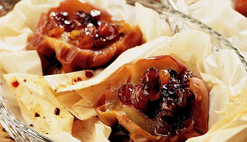 parçaları kesin. İçlerine elmaları yerleştirin. Üzerlerine margarin sürün. Toz şeker serpin. Yarım su bardağı elma suyunu elmaların üzerine gezdirin. Yağlı kağıtla elmaları iki kat olacak şekilde sarın. Önceden ısıtılmış 175 derece fırında 40 dakika pişirin. Diğer taraftan çubuk tarçın, vanilya, kuru üzüm, rendelenmiş limon kabuğu, pekmez ve kalan 2 bu bardağı elma suyunu birlikte kaynatın. Fırından çıkardığınız elmaların üzerindeki yağlı kağıtları tabak şeklinde açın. Üzerlerine kaynayan pekmezli şerbeti gezdirip servis yapın.