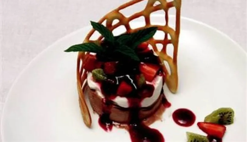 Krem şantiyi, vanilyalı dondurmayı, toz şekeri ve vanilyayı mikserde çırpın. Oluşan harcı ikiye bölün. Harcın bir bölümünü espresso ile karıştırın. Küçük bir kalıbın alt kısmına yerleştirin. Diğer harcı da üzerine yerleştirip buzdolabının dipfrizinde 24 saat dinlendirin. Soğuyan parfeyi servis tabağına alın. 5 adet çileği ve kiviyi küp şeklinde doğradıktan sonra parfeyi meyvelerle süsleyin. Sosu hazırlamak için 5 adet çileği mikserde püre haline getirerek pudra şekerini ekleyin. Sosu parfenin üzerine gezdirin. Nane yaprağını da yerleştirdikten sonra servis yapın.
