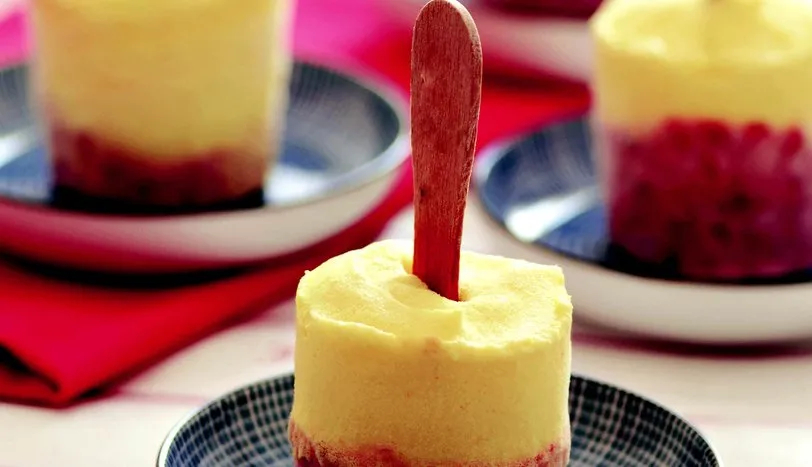 Kayısı ve çilekleri ayrı ayrı blenderden geçirip püre haline getirin. Krem şantiyi 1 su bardağı sütle çırpın. Yoğurt, toz şeker ve vanilya ekleyip karıştırın. Krem şantili karışımın yarısını kayısı püresine, kalanını çilek püresine ekleyip karıştırın. Yumurta aklarını bir tutam tuzla çırparak kar haline getirin ve yarısını kayısı püresine, kalanını çilek püresine ekleyin. Çorba kaşığı ile fazla karıştırmadan harmanlayın. Cupcake veya dondurma kalıplarına yarı yarıya kayısılı ve çilekli karışımı pay edin. Ortalarına çubuk yerleştirip, derin dondurucuda donana dek dinlendirin. Soğuk olarak servis yapın.