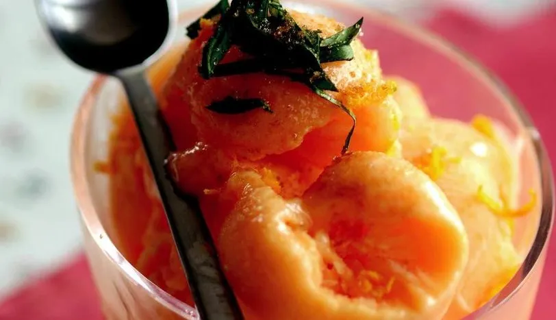blenderden geçirip püre haline getirin. Metal bir kaba koyun ve derin dondurucuya alın. Hafif donmaya başlayınca çıkarın ve tekrar çırpın. Ayrı bir kapta yumurta akını kar haline gelene kadar çırpın. Metal bir kaşıkla kayısılı karışıma ekleyin. Sorbeyi tekrar derin dondurucuya koyun. Servisten önce buzdolabının alt rafına yerleştirin. 20 dakika beklettikten sonra kaselere veya kuplara paylaştırın. Nane yaprağı ile süsleyip servis yapın.