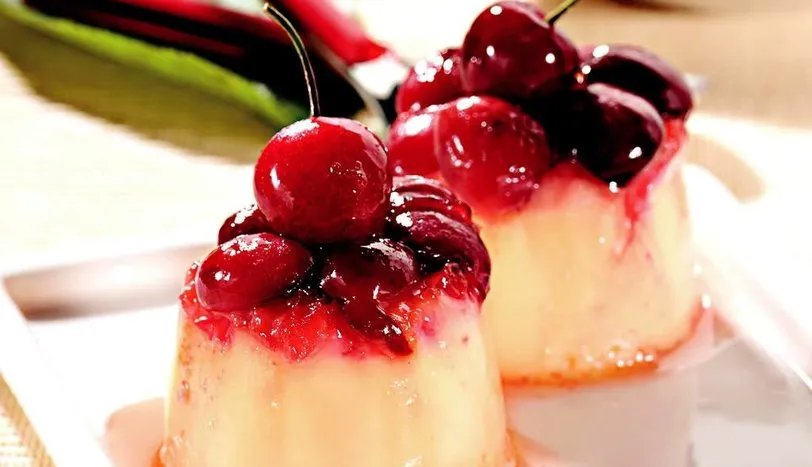 Süt, toz şeker ve vanilyayı kaynatın. Ocaktan alıp, çok hızlı şekilde karıştırarak yumurtaları, ardından kirazları ekleyin. Karışımı krem karamel kalıplarına pay edin. Önceden ısıtılmış 180 derece fırında 25 dakika benmari usulü pişirin. Soğuduktan sonra kalıpları servis tabaklarına yavaşça ters çevirip çıkarın. Üzeri için kiraz ve toz şekeri kısık ateşte, toz şeker eriyene dek pişirin. Soğuduktan sonra krem karamellerin üzerlerine pay edip servis yapın.