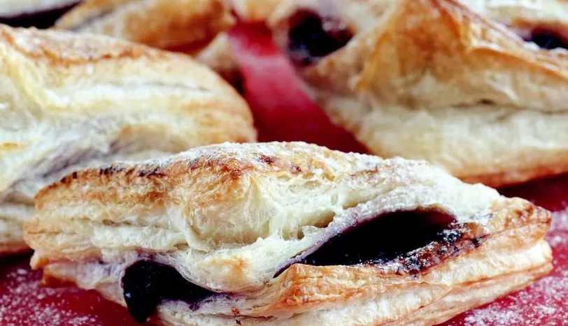 Milföyleri düz bir zemine yerleştirin ve kolay yapışmasını sağlamak için yanlarına birer parmak genişliğinde tereyağı sürüp kenara alın. Ayrı bir yerde kiraz ve toz şekeri kısık ateşte hafif sulanana dek pişirin. Mısır nişastasını su ile açıp kiraza ilave edin. 2 dakika daha pişirip soğumaya bırakın. Soğuyunca milföylerin ortalarına pay edin. Uçlarını bohça gibi kapatın. Yumurta ve sütü karıştırıp milföylerin üzerine sürün. 1 çorba kaşığı pudra şekeri serpip önceden ısıtılmış 160 derece fırında 20-25 dakika pişirin. Fırından alıp, kalan 1 çorba kaşığı pudra şekerini serperek servis yapın.