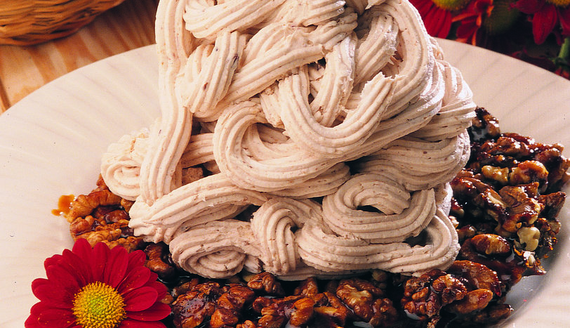 Toz şekeri bir tavaya alıp, eritin. Eriyen toz şekerin içine damla sakızı ve cevizleri atıp karıştırın. Yağlı kağıdın üzerine yuvarlak oluşturacak şekilde kaşık yardımı ile yayın. Donması için bir kenara alın. Diğer tarafta kestane püresini çırpılmış krema ile karıştırıp krema torbasına doldurun ve buzdolabına koyun. 1-2 saat sonra çıkartıp cevizli krokanın üzerine sıkın. Kestane şekeri ile süsleyin.