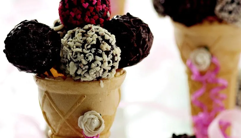 Kremayı bir kaba alıp ocağa oturtun ve ısıtın. Kaynama noktasına gelince ocaktan alıp,parçalanmış çikolatayı, tarçın ve muskatı ekleyin, karıştırarak eritin. Kek parçalarını ilave edip, kıvam alması için oda sıcaklığında 3-4 dakika dinlendirin. Karışımdan cevizden küçük parçalar koparıp elinizde yuvarlayın. Rendelenmiş çikolata, hindistan cevizi ve antep fıstığına bulayıp külah içinde servis yapın.