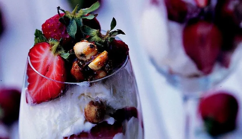 Şekeri bir tavaya alıp, kısık ateşte eritin. Fındığı, eriyen şekere ilave edip karıştırın. Yağlı kağıdın üzerine yayıp dondurun. Bıçak yardımıyla kağıttan sıyırıp parçalayın. Bu arada çilekleri yıkayıp yeşil saplarını kopartın ve dilimleyin. Krema için süt, toz şeker, un ve çırpılmış yumurtayı bir tencereye alın. Karıştırarak krema haline getirin. Ocaktan indirdikten sonra margarini ekleyip karıştırın. Kupların dibine fındığı paylaştırın. Üzerine kremadan yayın. Dilimlenmiş çilekleri dizin. Dondurmayı paylaştırın. Tekrar çilek dilimleri dizip nane yaprağı ile süsleyin.