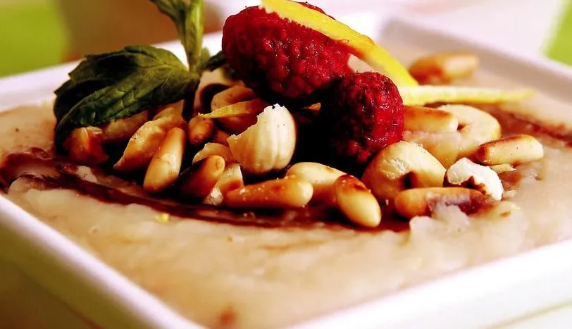 Kuru fasulyeyi bir gece öncesinden ıslatın. Ertesi gün suyunu süzün ve üzerini 4 parmak geçecek kadar su ekleyip, yumuşayana kadar haşlayın. İçine toz şeker ilave edin ve 5 dakika daha pişirin. Diğer taraftan kestaneyi de haşlayıp, süzün ve kabuklarını soyun. Kuru fasulye ile birlikte blender'dan geçirin ve derin bir kaba alın. Sıcak suda 10 dakika beklettiğiniz kuru üzüm, vanilya, ceviz, fındık, süt, gülsuyu ve tarçını katın. Tüm malzemeyi karıştırın. Tatlıyı kaselere paylaştırın. Buzdolabında 1 saat dinlendirin. Üzerini fıstık, fındık, frambuaz ve nane yaprağı ile süsleyip, servis yapın.