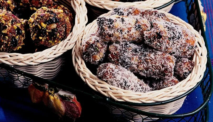 Cevizi kıyın. İnciri yıkayın ve saplarını koparın. Eriğin çekirdeğini çıkarın. Ceviz, küçük parçalara ayırdığınız kuru incir, kuru erik ve kuru kayısı ile kuru üzümü robottan geçirin. Bu karışımı bir kaseye alın ve elinizle ceviz büyüklüğünde toplar yapın. Hindistancevizi ve antepfıstığını ayrı tabaklara koyun. Topların yarısını hindistan cevizine diğer yarısını da antep fıstığına bulayın.