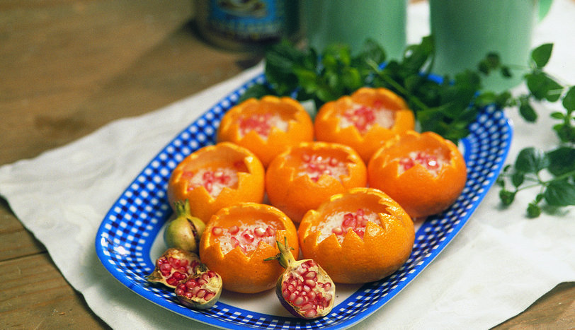 Mandalinaları yıkayıp, kuruladıktan sonra üstünden kapak çıkararak kesin. 1 Bir tatlı kaşığı yardımıyla, meyvelerini kabuğunu kırmadan boşaltın. 2 Içi boşalan kabuk-kaselerin uçlarını makasla keserek zikzaklar yapın (dilerseniz düz de bırakabilirsiniz). Mandalinaları katı meyve sıkacağından geçirerek ya da bir süzgeçte bastırarak suyunu çıkartın (mandalina suyunun toplam iki buçuk bardak olması gerek). Küçük boy bir tencereye 2 çorba kaşığı buğday nişastası ve yarım su bardağı suyu koyup, nişastayı eritin. Daha sonra mandalina suyunu da ekleyip, karıştırarak pişirin. Kaynamasına yakın, 4 çorba kaşığı şekeri ekleyin (mandalinalar ekşiyse, tadına bakarak şeker miktarını 10 çorba kaşığına kadar arttırabilirsiniz). 3 Bu jöleyi 2-3 dakika beklettikten sonra, hazırladığınız mandalina kabuklarının içine bir tatlı kaşığı yardımıyla doldurun. Servis yaparken üzerine hindistan cevizi ve nar taneleri serpin.