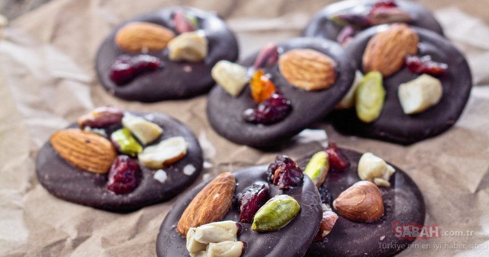 3 Erittiğiniz çikolatayı sıkma torbasına alın. Pişirme kağıdı serili tepsiye yaklaşık bir tatlı kaşığı kadar sıkın. 1 TL'lik madeni paradan biraz daha büyük olacak şekilde yayarak ince bir disk şekli verin. Çikolatalar sertleşmeden kuru meyve ve kuru yemişleri üzerine serpiştirin. Oda ısısında en az 1 saat bekletip servis yapın.