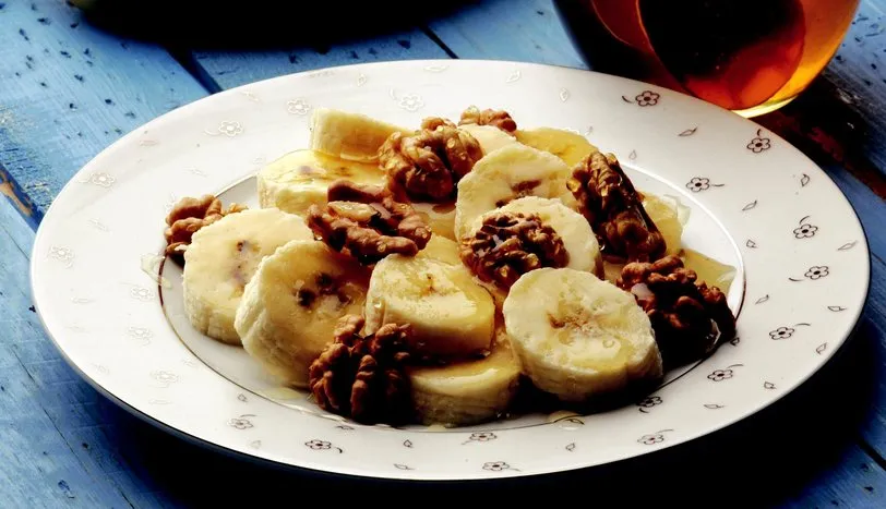 Muzları halka halka dilimleyip servis tabağına alın. Muz dilimlerinin üzerine limon suyu gezdirin. Ceviz içini muzların üzerine serpiştirin. Balı, muz ve cevizin üzerini gezdirip servis yapın.