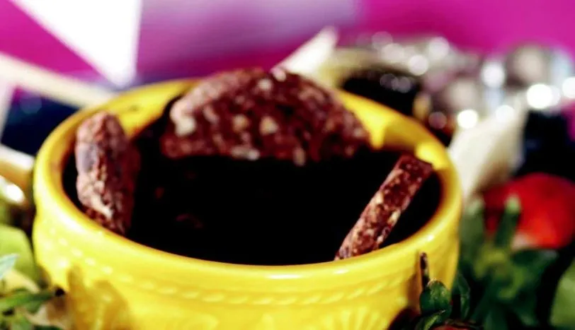 Muz ve kivilerin kabuklarını soyup dilimleyin. Çöp şişlere birer dilim muz ve kivi, 1 adet çilek olacak şekilde dizin. Meyveler bitene kadar işleme devam edin. Sos için light bitter çikolatayı benmari usulü eritin ve bir kaseye alın. İçine müsli bisküviler yerleştirin. Meyve çöp şişleri çikolatalı sosa batırıp yiyin.