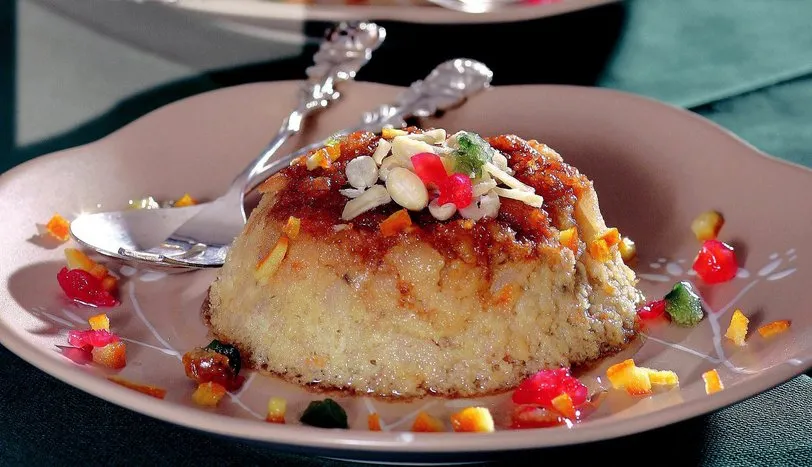 Kenarlarını bıçak yardımı ile kalıptan ayırarak servis tabağına ters çevirin. Üzerini file bademle süsleyerek servis