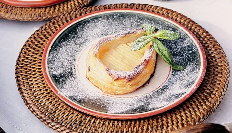 Armutların kabuklarını soyup boylamasına ikiye kesin. Çekirdek yataklarını temizleyin. Üç parça yarım armudu şekillerini bozmadan enine incecik dilimleyin. Dördüncü parçayı kalıp olarak kullanmak için bekletin. Dilimlediğiniz armutların üzerine pudra şekeri serpin. Armutlar şekeri emince eritilmiş tereyağı sürüp kenara alın. Ayırdığınız armudu milföy hamurlarından birinin üzerine koyup kenarlarından bir parmak fazlalık kalacak şekilde kesin. Kalan milföyleri de aynı şekilde hazırlayın. Daha sonra 4 adet milföyün üzerine armudu koyup tam dibinden kesin. Elde ettiğiniz armut şeklindeki halkayı bozmadan çıkarın. Kalıp olarak kullandığınız armuda da diğer parçalara uyguladığınız işlemleri uygulayın. Halka armutları diğer parçaların üzerine yerleştirin. İçlerine incecik dilimlediğiniz armutları yerleştirin. Yumurta sarısı ve sütü çırpıp milföylerin üzerine sürün. Önceden ısıtılmış 200 derece fırında 20 dakika pişirin. Pudra şekeri serpin ve nane yaprakları ile süsleyerek servis yapın