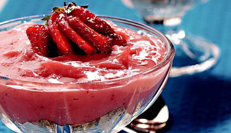 Mısır gevreğini derin bir kaba alın. Fındığı hafif kavurun ve soğuduktan sonra robottan geçirin. Çikolatayı benmari usulü eritin. Fındık, çikolata ve toz şekeri mısır gevreğinin içine katın ve karıştırın. Bu karışımı kupların içine paylaştırın. Çilekli sos için çilekleri yıkayın ve 4 adet çileği kenara ayırın. Kalanların saplarını koparın ve blenderden geçirip, püre haline getirin. Tencereye aldığınız çilek püresinin içine krema, mısır nişastası ve toz şeker katın. Sürekli karıştırarak koyu bir kıvam alana kadar pişirin. Hafif ılındıktan sonra kuplardaki tatlının üzerine paylaştırın. Çilekle süsledikten sonra donması için buzdolabında 1-2 saat bekletin ve servis yapın.